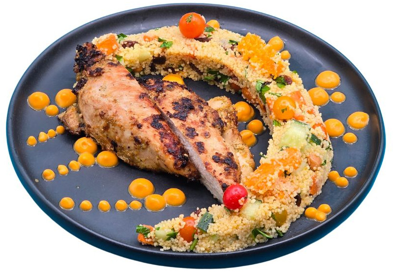 Succombez à cette salade de couscous généreuse, un véritable mélange de saveurs et de textures irrésistibles. Le couscous léger et aéré est parfaitement accompagné de morceaux de poulet tendre, grillé à la perfection, apportant à chaque bouchée une richesse savoureuse. La vinaigrette maison à base de patate douce et miso, douce et légèrement sucrée, enrobe le tout d'une douceur veloutée et d'une touche umami exquise, sublimant chaque ingrédient. Des morceaux de patate douce rôtie, fondants et légèrement caramélisés, ajoutent une touche sucrée et réconfortante, tandis que des légumes frais apportent du croquant et de la fraîcheur. Un plat équilibré, nourrissant et plein de caractère, parfait pour un repas léger, gourmand et plein de saveurs.