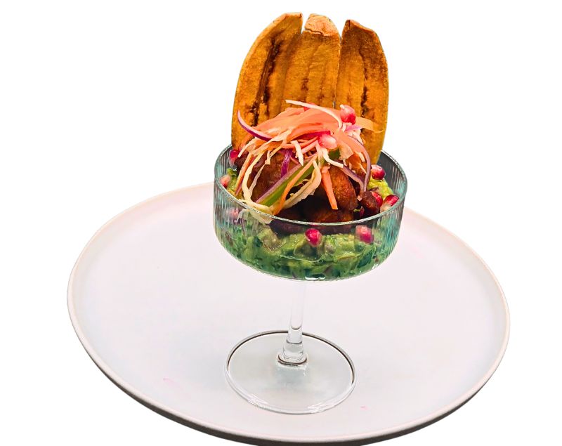 Plongez dans un mélange de textures et de saveurs qui évoque les tropiques à chaque bouchée. La Trilogie tropicale marie la fraîcheur d'un guacamole onctueux, la richesse d'un porc sauté tendre et savoureux, et le croquant irrésistible de croustilles de plantain dorées. Chaque élément est pensé pour se compléter et créer une expérience gustative équilibrée, à la fois festive, généreuse et raffinée. Une entrée aussi belle à regarder qu'agréable à déguster, appropriée pour ouvrir l'appétit en beauté.